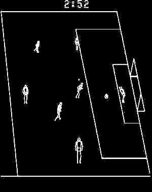 First and foremost, it can be difficult to get the ball downfield. The opposing defenders have a much easier time getting the ball from you than you will have in getting it from them. The game uses the same stealing technique featured in Atari's Basketball in which you merely overlap a player in order to take the ball. With the lack of a speed burst button, it can be difficult to catch up with a player on a breakaway. Your other option in tracking down the opposing players is to switch control to players further downfield. This can be problematic in that you can never tell which player you will switch to. If the opposing team gets close to your goal, good luck. I had to look up the goalie controls because they were so counterintuitive (in most decent soccer games, your goalie with either be on automatic control, or you will automatically switch to him when the opposing team gets close. In this game you have to hold down a button just so you can have the pleasure of moving him from side to side with little chance of being effective). So the Vectrex ran up four goals on me before I ever got the chance to figure out how to stop the bleeding. Also, the collision detection is suspect. The opposing goalie will be sliding from side to side as you approach the goal. If you guess right and shoot the ball to a place he isn't covering, there's still a 75% chance he'll still stop the ball even though he's nowhere in range. Oh, and when you pass the ball, you'll either kick it a few inches out in front of yourself in slow motion, or you'll rocket it way downfield with no idea who it's going to. There's no way to tell which it'll be. It just makes for a frustrating experience.